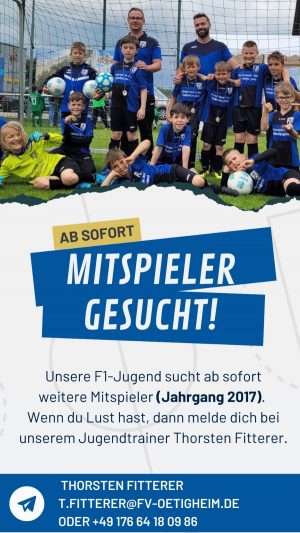 Unsere F1-Jugend sucht ab sofort weitere Mitspieler (Jahrgang 2017). Wenn du Lust hast, dann melde dich gerne bei unserem Jugendtrainer Thorsten Fitterer. Thorsten Fitterer t.fitterer@fv-oetigheim.de